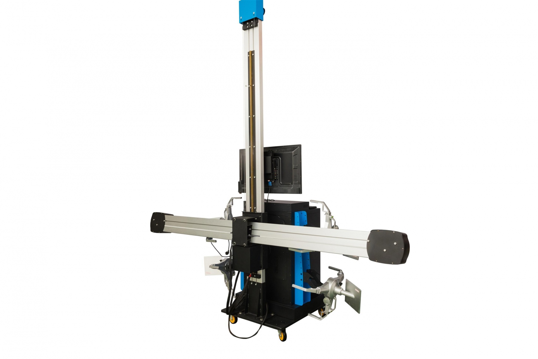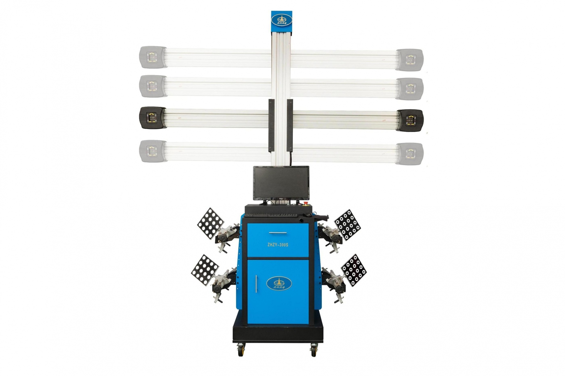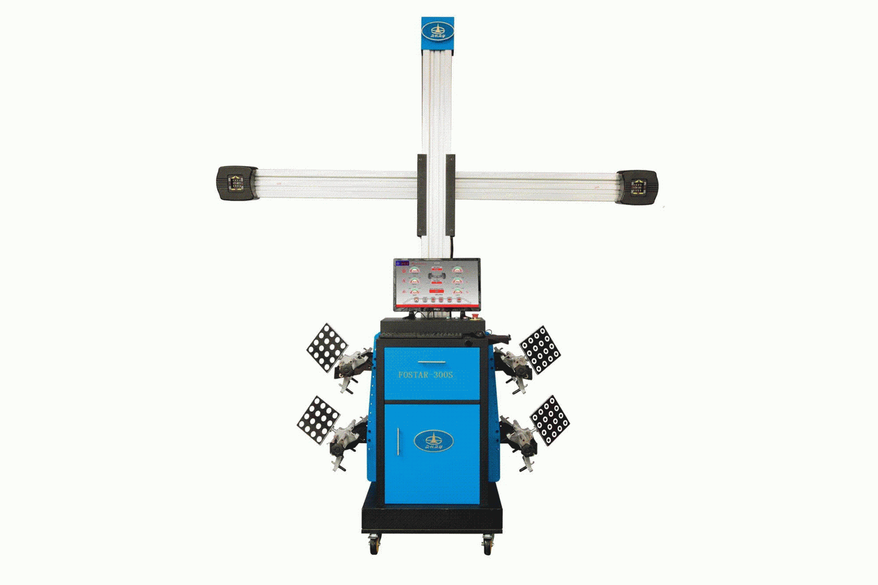 - 产品结构特点:机柜采用可移动式机箱,立柱电动升降;相机采用索尼进口相机500万像素镜头系统,处理图片速度30张/秒,反光板壳体采用航空航天铝合金材料制做,动态视觉算法技术,软件操作简便,快速读取数据;三维动态显示图像操作指引指导操作;滚动补偿,量短微距离推车,轴距差、轮距差、检测数据精确,标板实时监控,标准四点夹具可检查10-23寸轮辋,设备维护保养简单,无需定期标定;铝合金转角盘方便检查方向基参数及前轮前束倾角等参数;标准数据库,免费一年更新数据库文件一次;产品经ISO质量体系及欧盟CE安全认证。