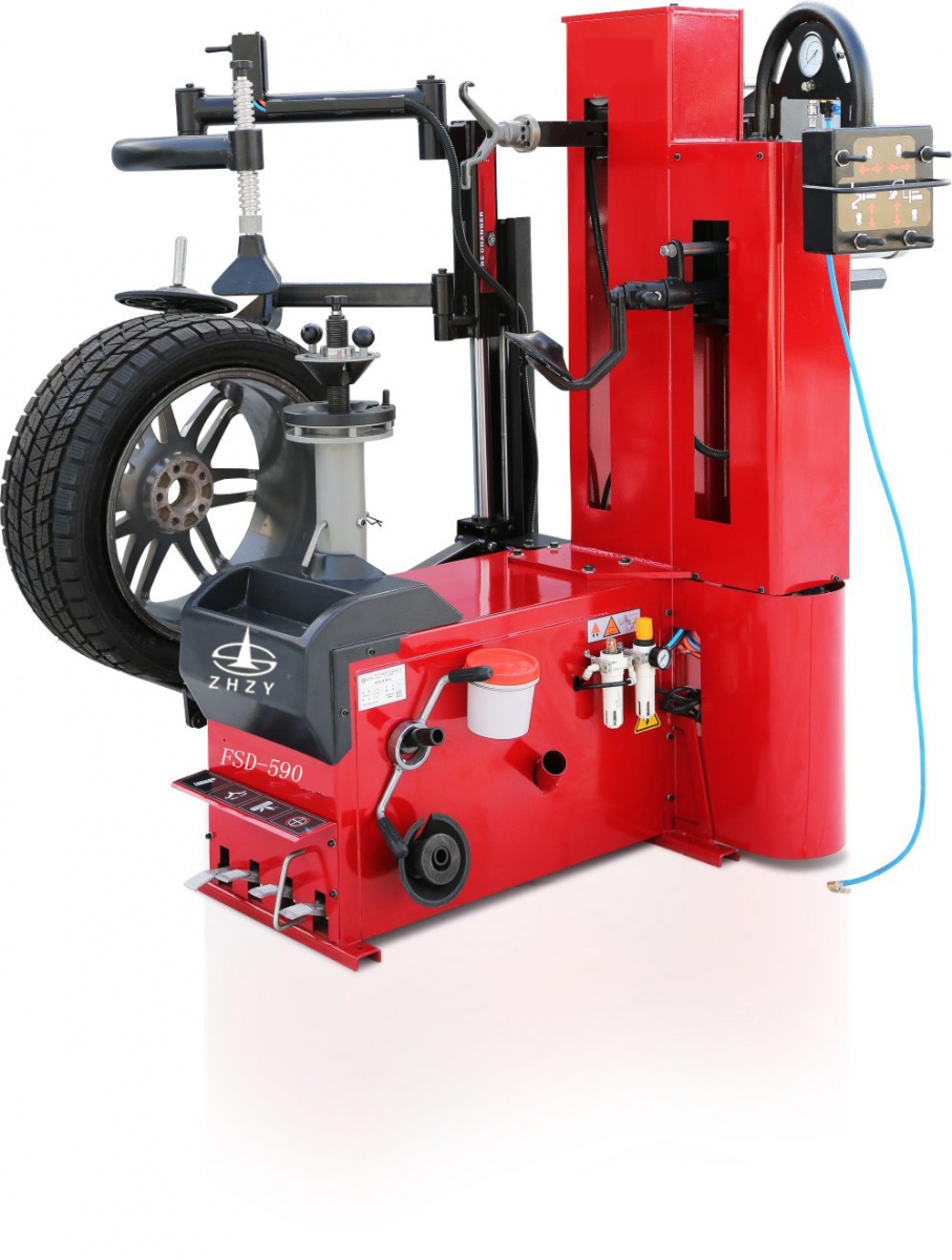 本机为电气一体化的自动轮胎拆装机,配有羊角勾头(勾头自动翻转、自动进退);自动摆臂助力装置;气动自动锁紧装置;压轮机械受压变角装置;左侧又配有光轴定位装置,能使方臂无间隙,无摆动,拆卸轮胎轻松自如。