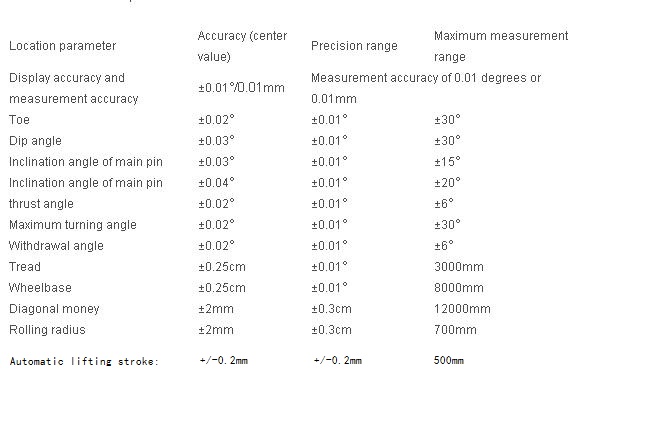 Product structure features: mobile cabinet, intelligent short distance electric lifting of column; camera adopts Sony imported camera 5 megapixel lens system, processing speed 30 pictures per second; reflector shell is made of aerospace aluminum alloy material, dynamic vision algorithm technology, software operation is simple, fast reading data; 3D dynamic display image operation guide operation It can be used for: double column lift, small scissors lift and other platforms; the patent number of product software: 2017sr303898; the patent number of automatic lifting mechanism: 202021852998.5; Aluminum alloy corner wheel is convenient to check the parameters such as steering base parameters and front wheel toe in angle; the standard database is updated once a year for free; the product has passed ISO quality system and EU CE safety certification.