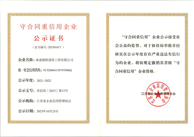 近日,南通德勝建筑工程有限公司再獲省級2021-2022年度守合同重信用企業榮譽稱號。